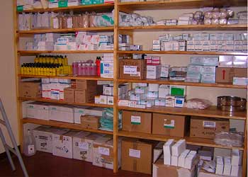Farmacia abastecida con medicamentos básicos y material sanitario.